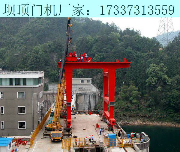 甘肅張掖壩頂門機銷售廠家17337313559固定雙吊點懸臂軌道式桁吊的安裝,包括以下步驟第一步將所有零部件運至施工現場塔機工作范圍之內,將平衡機構20噸雙輪滑 車裝在懸臂縱梁尾部,將懸臂縱梁裝在支腿上,用塔機將懸臂縱梁及支腿整體分別吊至相 鄰兩間墩頂,放在預先確定好的位置上,間墩頂面不平時可用鋼板塊調整;第二步將平移橫梁用塔機橫擔在兩懸臂縱梁上,使平移橫梁兩端的滑塊剛好放 在兩懸臂縱梁的滑道上;第三步將起升卷揚機分別安裝在平移橫梁的兩端設計位置并接好電源;第四步將動滑輪即50噸五輪滑車裝在動滑輪組吊梁上并同定滑輪即50噸四輪滑車一同吊至間墩頂,放在起升卷揚機正下方附近;第五步穿繞起升鋼絲繩,并將繩頭用四個繩卡卡出一個環、用銷子固定在平移橫 梁的設計位置,然后用塔機將定滑輪安裝在平移橫梁的設計位置,最后啟動卷揚機使動滑 輪及其吊梁懸在空中;第六步安裝平衡機構將10噸單輪滑車掛在懸臂縱梁尾部正下方的閘墩地錨 上,然后穿繞鋼絲繩,并將二繩頭分別用二個繩卡卡出一個環,一頭用5噸卸扣掛在一側地 錨上,另一頭掛上10噸倒鏈,倒鏈的鏈鉤掛在另一側地錨上,最后拉緊倒鏈使鋼絲繩吃力;第七步用5噸倒鏈將平移橫梁拉至懸臂縱梁懸臂端設計位置;第八步安裝平移牽引機構將4個16噸四輪滑車用10噸卸扣分別掛在平移橫梁 兩端和懸臂縱梁尾端的錨環上;將導向滑輪即5噸單輪滑車掛在懸臂縱梁尾部正下方的閘 墩地錨上;將牽引卷揚機固定在閘墩頂面的適當位置并接好電源;最后穿繞鋼絲繩、啟動 卷揚機使鋼絲繩拉直;第九步啟動起升卷揚機將動滑輪組吊梁放至閘墩根部的軌道梁上,安裝吊具,吊 具必須安裝在軌道梁端的設計位置,以保證軌道梁吊至間墩頂水平移動時順利通過支腿;第十步檢查,主要檢查各部位銷子、滑車是否安裝正確;卷揚機各部位接線是否 正確;卷揚機剎車是否調整到位、是否靈敏;鋼絲繩纏繞時是否有損傷。