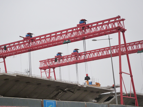 一、單主梁和雙梁起重機的選用:符合通用門式起重機有關規定。起重量在50t以下,一般情況下。跨度在35m以內,無特殊使用要求,宜選用單主梁式。如果要求門腿寬度大,工作速度較高,或經常吊運重件、長大件,則宜選雙梁門式起重機。