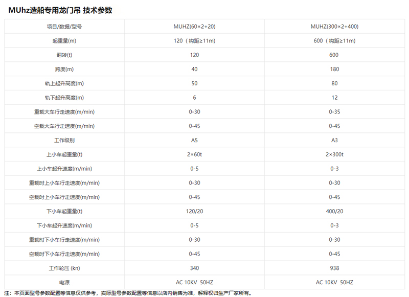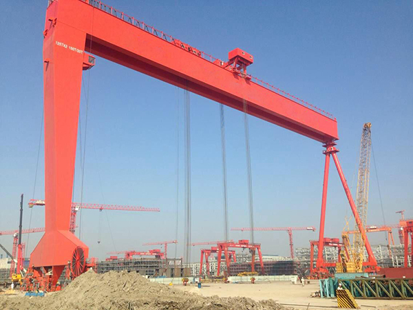造船龍門起重機,用于船臺拼裝船體,常備有兩臺起重小車:一臺有兩個主鉤,在橋架上翼緣的軌道上運行;另一臺有一個主鉤和一個副鉤,在橋架下翼緣的軌道上運行,以便翻轉和吊裝大型的船體分段。起重量一般為100~1500噸;跨度達185米;起升速度為 2~15米/分,還有0.1~0.5米/分的微動速度。